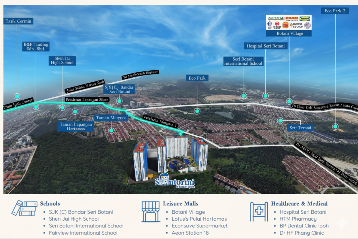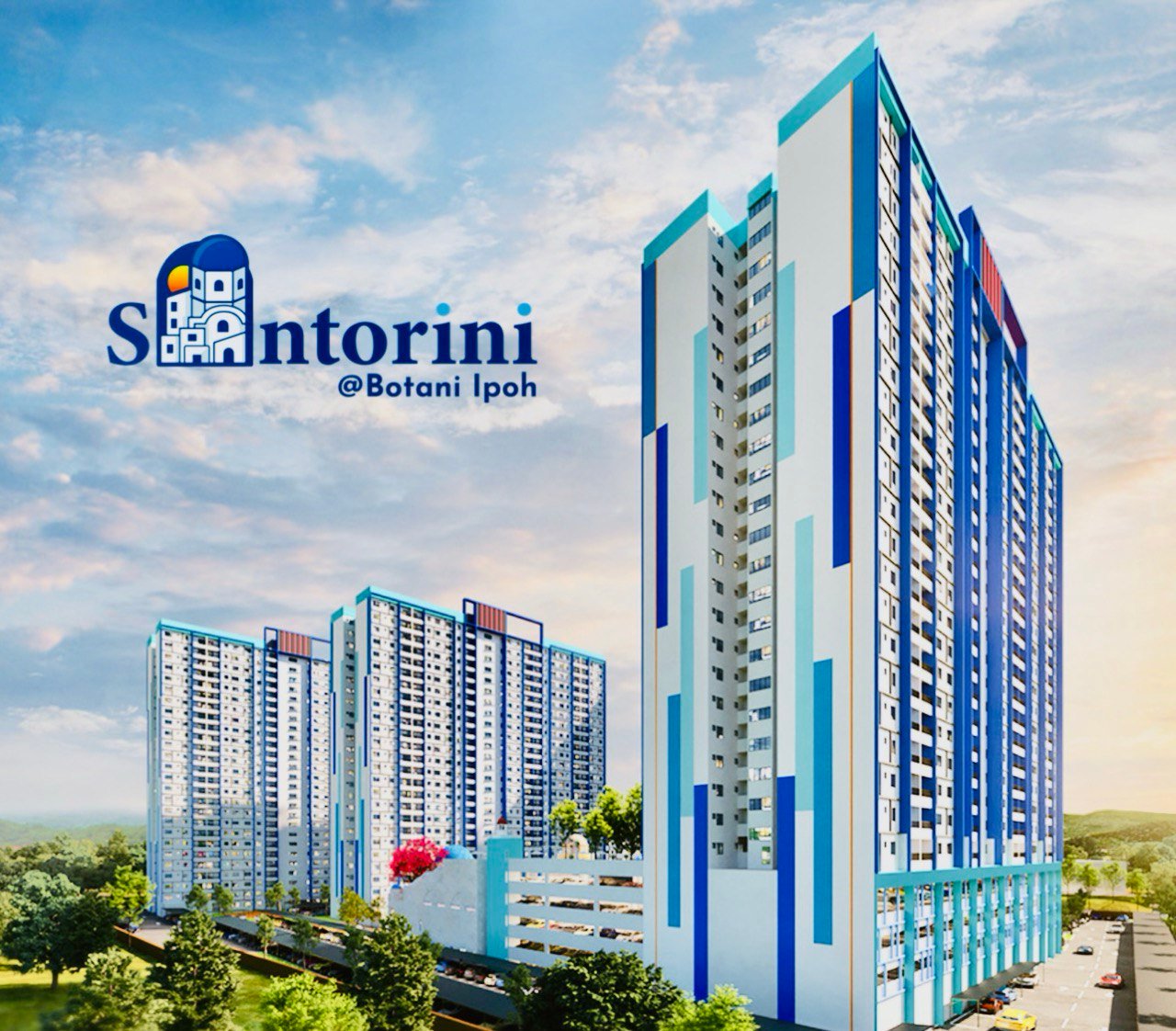 Step into a world where every day feels like a getaway at Santorini @ Botani Ipoh, a freehold condominium inspired by the charm of Greece’s famous island paradise. Nestled in the serene township of Bandar Seri Botani, this exclusive residence invites you to experience resort-style living surrounded by lush greenery, open skies, and beautifully designed architecture in shades of white and blue.
